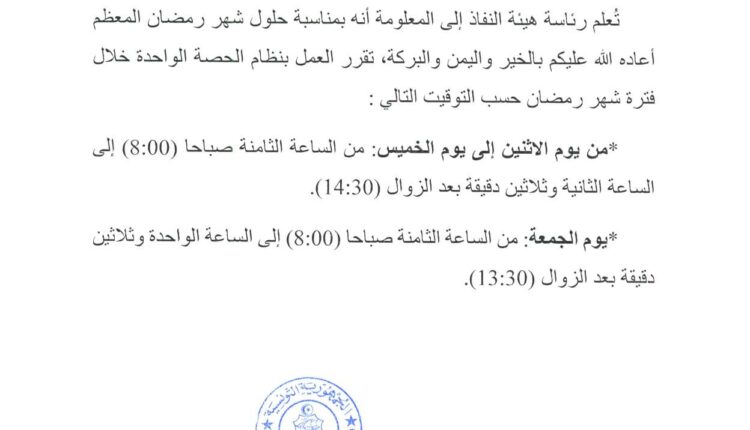 تعلم هيئة النفاذ إلى المعلومة أن توقيت العمل سيكون خلال شهر رمضان لسنة 2023 الموافق لـ ـ1444 هجري على النحو التالي: